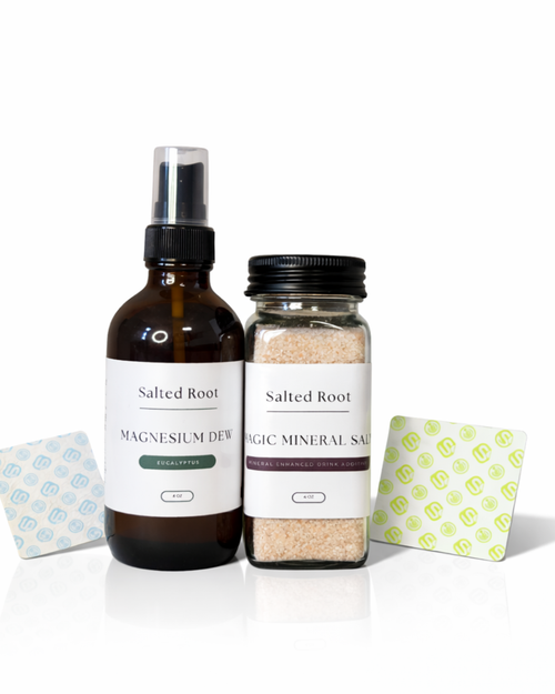 Magnesium Dew and Magic Mineral Salt work together as your daily mineral foundation. Each system includes a Super Patch trial so you can test targeted support before committing to full packs.